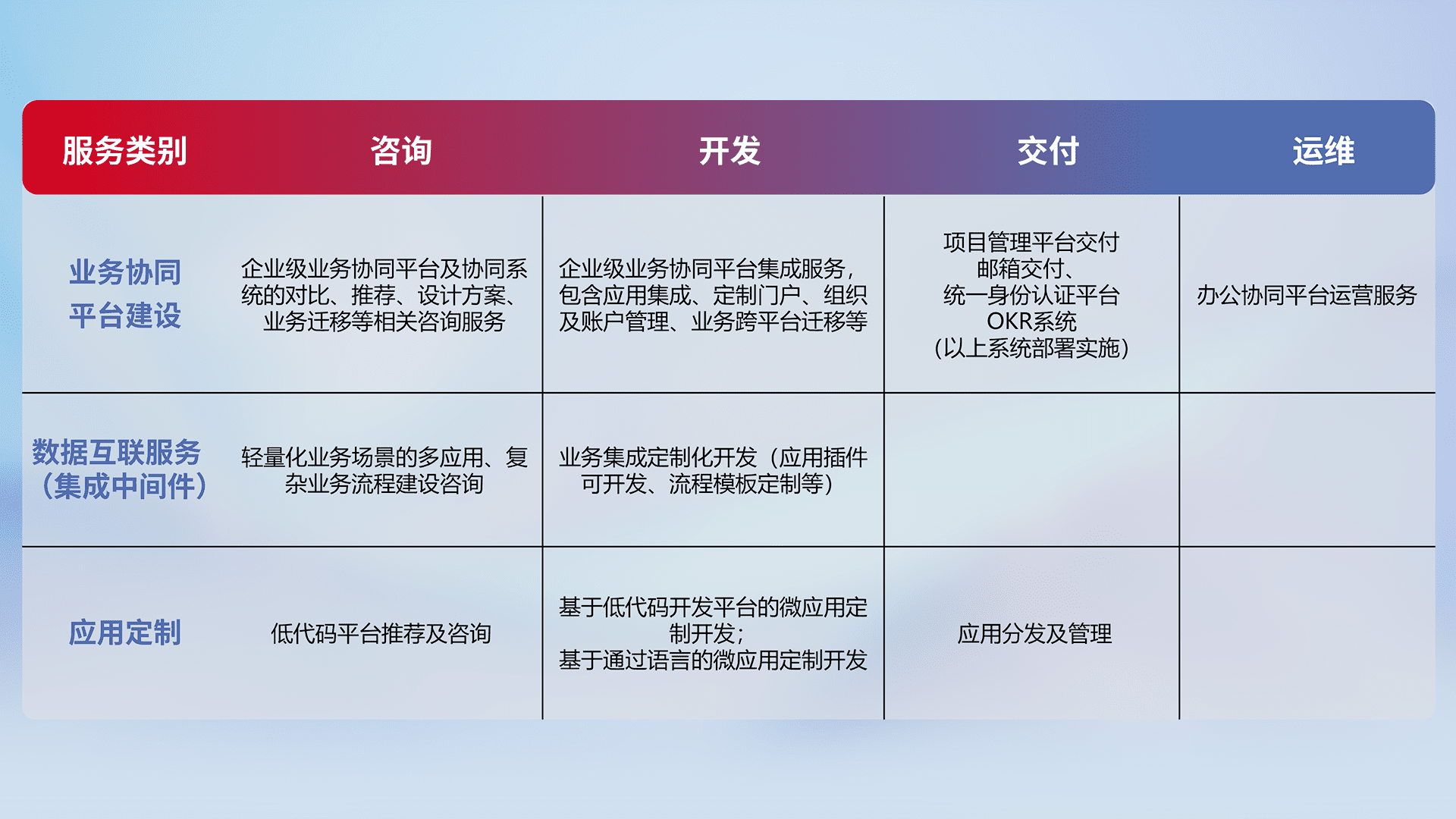 针对钉钉、、企微、、、、IDaas等平台级产品提供产品的规划、、、方案、、交付、、、、定制化开发等服务,,实现如统一协同办公、、、智能客户服务、、、、混合会议管理、、智能数据查询、、等业务场景,,,,实现数字化转型。。。。