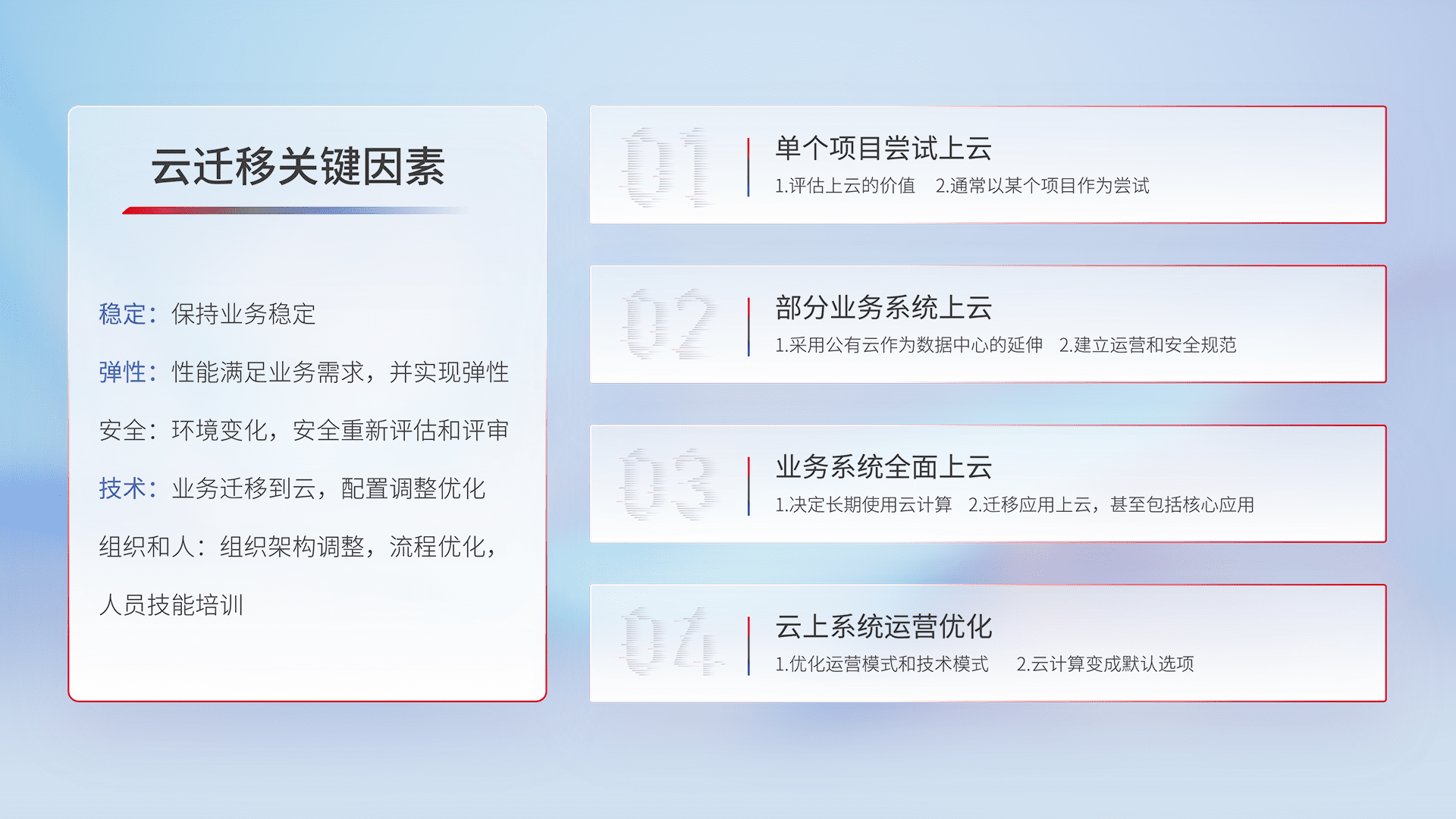结合实际业务,,从规划设计、、、云平台选型、、云原生改造、、、数据迁移、、、、集成交付,,,迁移全过程为客户识别最佳上云路径,,做好风险识别管理,,,,设计网络架构、、、、身份权限、、、、安全审计合规、、、、操作审计、、、日志审计、、、、监控告警策略、、、、多站点容灾设计等,,,,对云上基础设施进行整体规划,,,,提升IT治理水平,,以满足弹性、、、高可用、、、、高性能的需求。。。